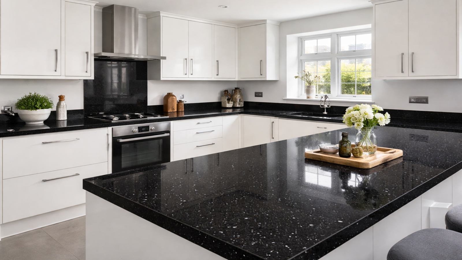 The polished finish enhances the surface’s subtle sparkle while remaining smooth and hard-wearing. Black Shimmer also offers reliable heat resistance during normal kitchen use and resists scratches and general wear, helping the worktop maintain its appearance over time.