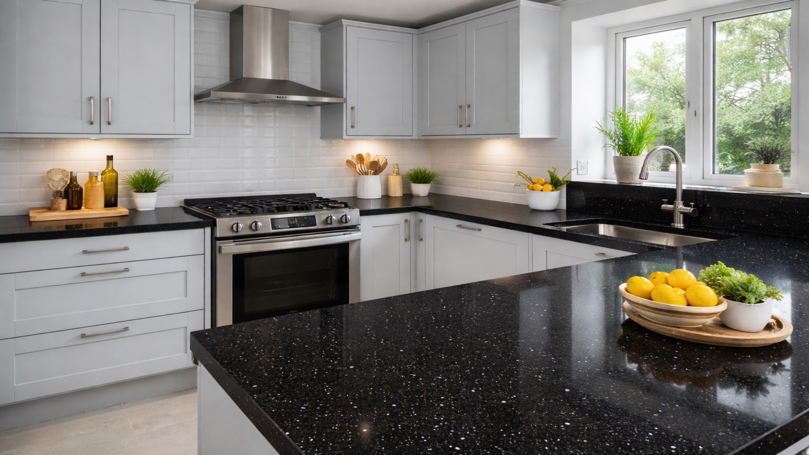 The Black Shimmer quartz worktop offers a sleek, contemporary surface with subtle visual depth. A rich black background is enhanced with fine reflective flecks that catch the light gently, creating a refined shimmer without overpowering the space. This balanced design makes Black Shimmer a versatile choice for modern kitchens, pairing particularly well with light cabinetry, metallic accents, and minimalist interiors.